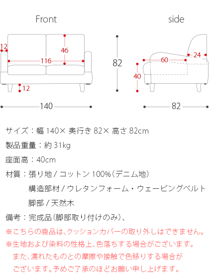 サイズ:幅140×奥行き82×高さ82cm 製品重量:約31kg 座面高:40cm 材質:張り地/コットン100%(デニム地)、構造部材/ウレタンフォーム・ウェービングベルト、脚部/天然木 備考:完成品(脚部取り付けのみ)、※こちらの商品は、クッションカバーの取り外しはできません。
