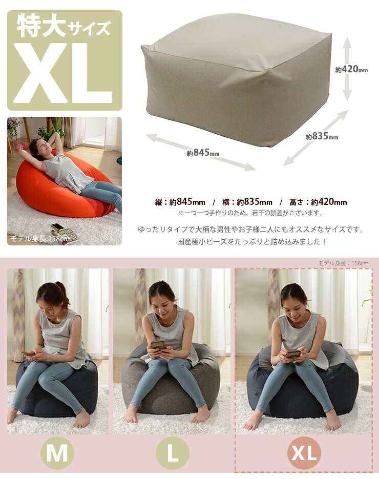 ●商品詳細 -infomation- 商品名 QUBE XLサイズ【キューブXL】 サイズ 本体サイズ:約 幅55〜84.5×奥行55〜83.5x高さ最大42cm 材 質 中材:発泡ポリスチレンビーズ 収縮する生地:ポリエステル 88%/ポリウレタン 12% 収縮しない生地:ポリエステル 100% カラー ベージュ レッド アッシュグレー インディゴブルー グリーン ライトブルー ブラックグレー 重 量耐荷重 【重量】 約5.9kg 【梱包重量】 約6.9kg 梱包サイズ 約 幅55x奥行55x高さ65cm 生産国 日本製 備 考 ※他商品との同梱は出来かねます。