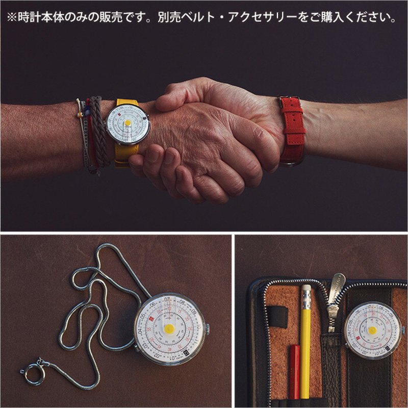 まるで円形計算尺をそのまま時計にしたかのようなフェイスは、時間が進んでいく様子をそのまま見ていたくなるほどユニーク。